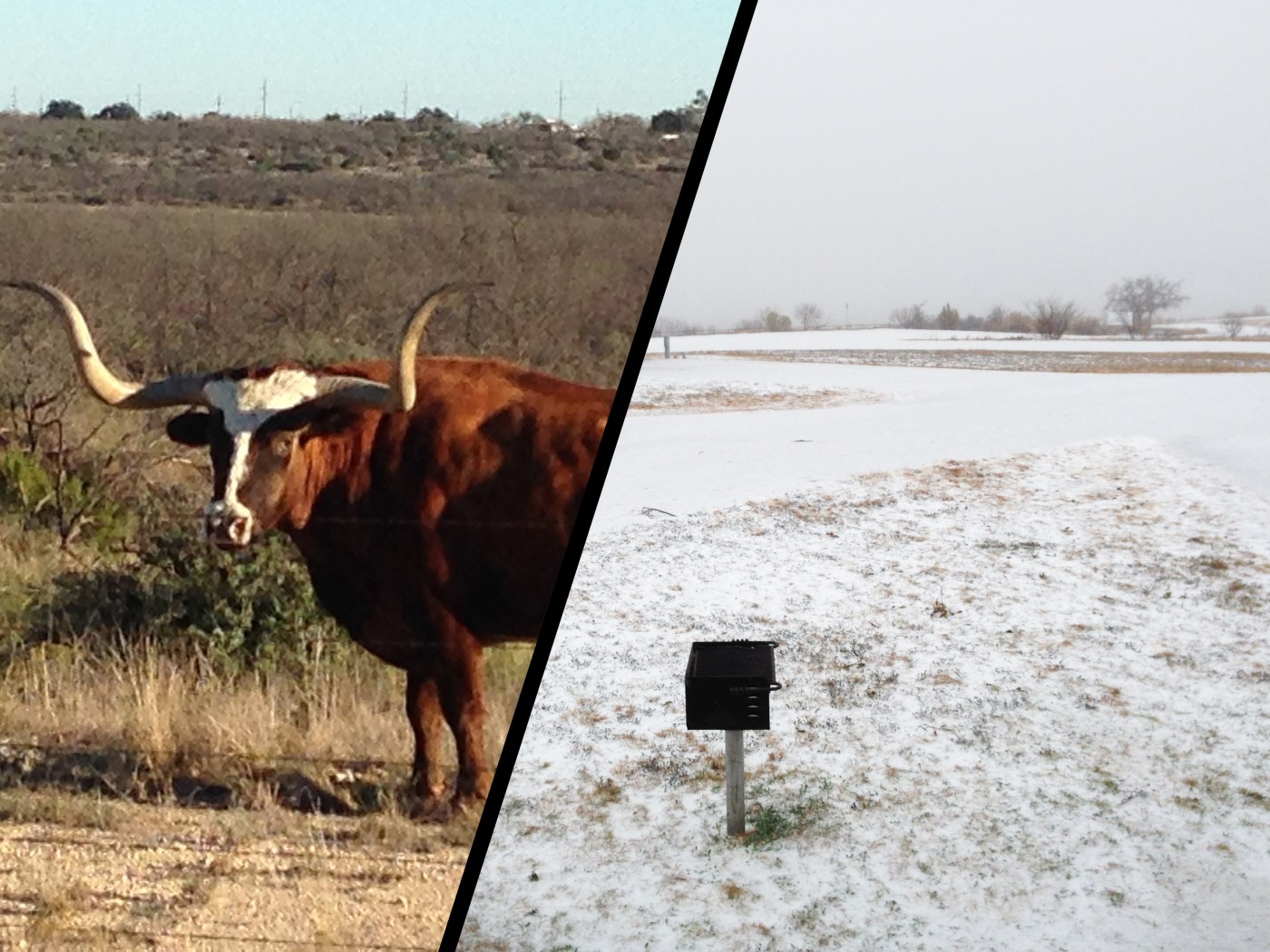 On Christmas Eve and Christmas Day we enjoyed temperatures of 80 degrees, and so were the Texas State Longhorn herd who also reside here! The day after, we were talking with our neighbor, David, while the dogs played outside at San Angelo State Park. Perfect day for completing our repair; slightly cloudy, with a temperature of 78 degrees and hardly any wind at all. Then, literally within 5 seconds, the temperature dropped 15 to 20 degrees as a front blew in across the lake. Last night we crashed at our parent’s house as the storm created 30 to 40mph winds. Today (Sunday, December 27th), we are below freezing with blizzard conditions expected to last through the night.