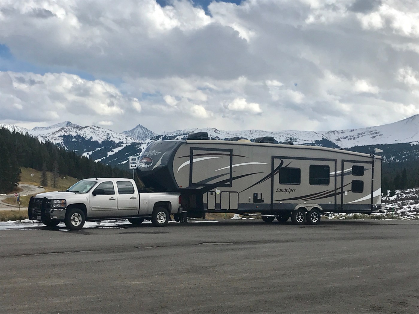 We made it to Pueblo. Well, we made it about 30 minutes south of Pueblo and the truck decided it didn’t want to switch gears. That’s a problem. We pulled off on a side ramp out of the way of traffic and called the insurance company…again. They were going to arrange for a tow. In about 30 minutes, they called us back and informed us that due to it being a Sunday, they were not having any luck finding a tow truck for us to tow both the truck and 5th wheel. Oh joy!